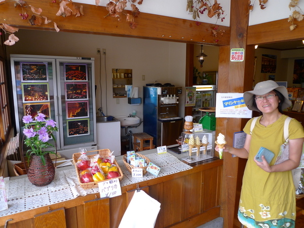 今天太陽露臉,天氣頗熱,走沒幾步就看到大分縣特產「青橙」~「『カボス』工房」,門口的霜淇淋旁邊寫著:一天賣986枝,真的假的,吃看看就知道!
