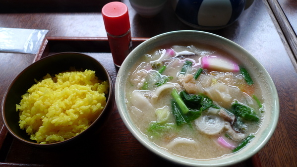 其實就是「味噌什錦麵疙瘩」+「黃飯」,味噌湯頭很香,而且不會過鹹,很合我們胃口,吃完很想買一些這裡的味噌回家。