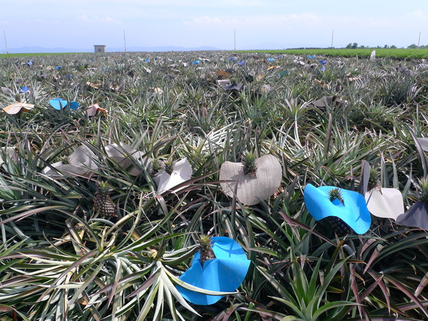這一畦的鳳梨比較好命,通通穿上防曬衣了。