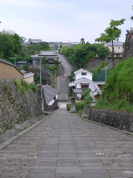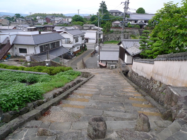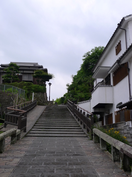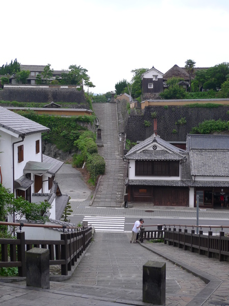 最長、拍照最美的坡道,階梯底部就是「商人の町」,繼續往上的階梯是「志保屋の坂」,可以通往「『南台』武家屋敷」,「北台」上的這個路口是最可以清楚看出杵築「三明治型坂城」特色的地點。
