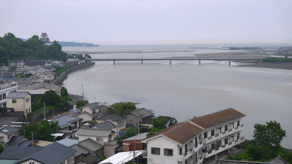 「一松邸」前是視野遼闊的「展望台」,面對八坂川,長長的杵築大橋橫跨其上,河口左上方的杵築城清楚可見。