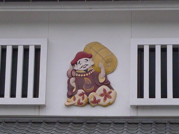 米店牆壁上有表情超可愛的「大黑天」圖案的浮雕「縵繪」。