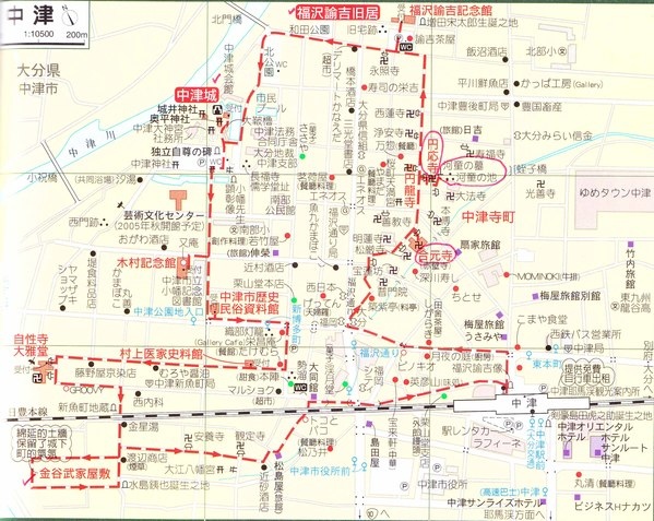昨天飯店櫃檯人員建議我們不要太早用餐,才能避開學生團體,於是出發,開始今天第一個行程~按照「散步地圖」的路線,在早餐前把「中津城下町」走一圈。
