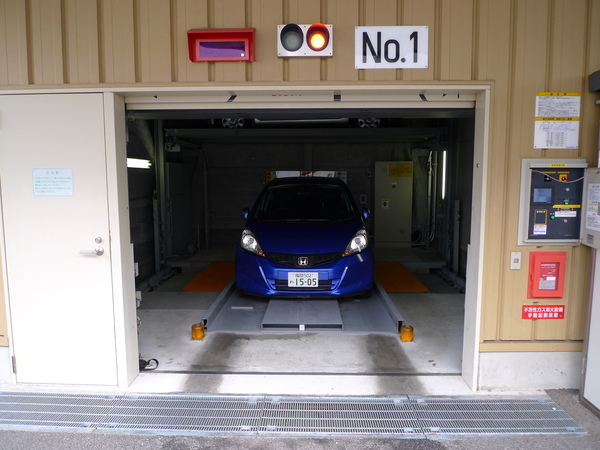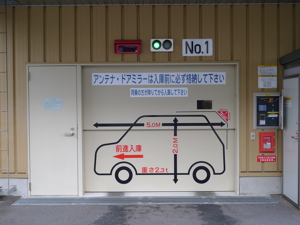 這裡是立體停車塔,我們在日本沒有停過這種,辦好住宿登記之後,櫃檯小姐給了我們一張停車卡,教我們把卡放在右邊的黑格子區域感應,門就會打開。