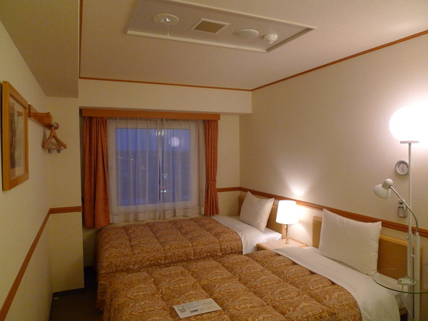 東橫inn的房間長得都一樣,我們住的是「雙床房」兩張單人床,乾淨、設備齊全,但是實在小得可憐,放了行李之後,連走路都難,我們尤其不喜歡滑不溜丟的被子,睡得很不安穩。