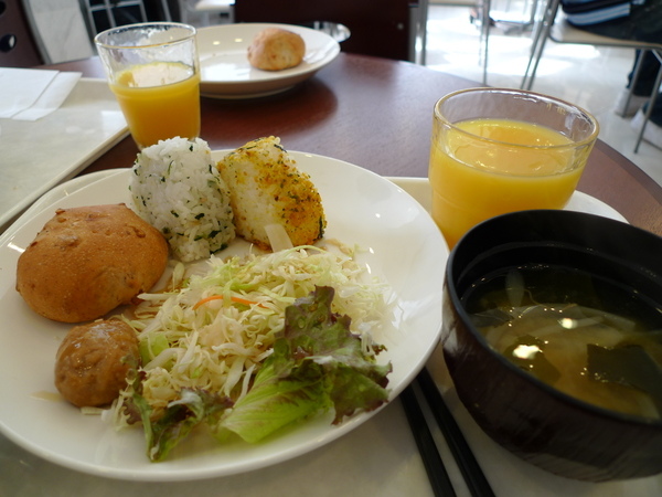東橫inn的免費早餐都很簡單沙拉、飯糰、麵包、果汁、味噌湯,雖然已經過了九點,學生還是很多,食物一拿出來立刻被秒殺,還是得要大排長龍,無論如何,我們還是吃飽了。