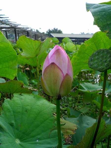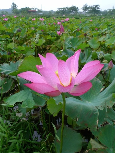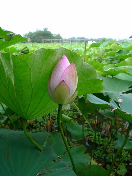 沿著有一點濕滑的泥土路,在高大的蓮花田間參觀(注意狗屎!)