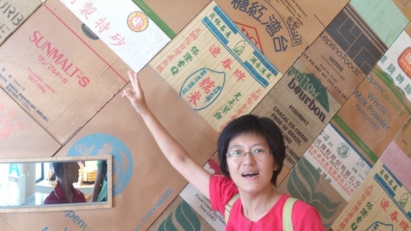 整面牆都是用各種糕餅原料的紙箱或包裝袋拼成的