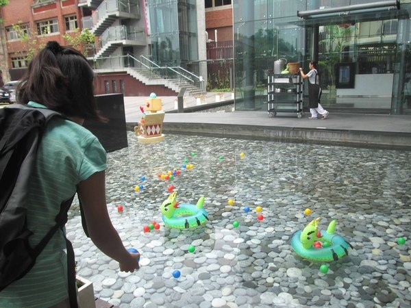 小朋友站在水池邊緣
