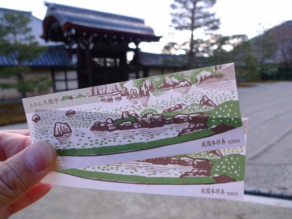 我們只打算參觀真正的古蹟~「曹源池」,沒打算參觀諸堂內部,所以只買了兩張庭園參拜券¥500円/人,上面印有版畫風格的曹源池圖案。