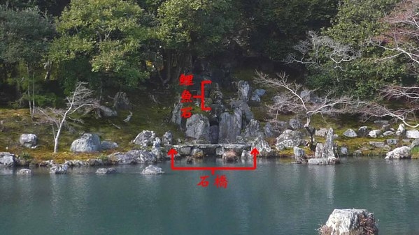 把畫面拉近,這座石橋由三塊板狀石塊砌成,據說是日本最古老的石橋;石橋上本來有一道小小的「龍門瀑布」,中間有一塊「鯉魚石」,意味著鯉魚幻化成龍的姿態,可是現在瀑布已經乾涸,無法見到魚躍龍門的造景。