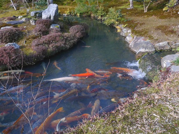 池邊的細小溪流,聚集了不少悠遊的鯉魚。
