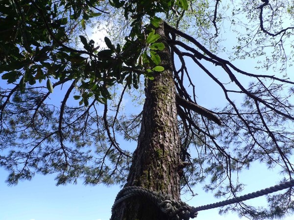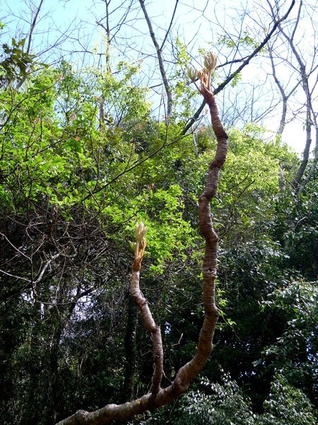 這棵「木通」很厲害,長在大樹包圍的山坡上,為了爭取陽光,樹幹伸得很遠很長,直到步道中央才開始萌發新葉。