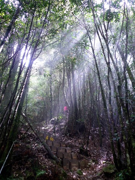 連續的爬梯走得我們氣喘吁吁,還好有陽光照進霧氣未散的林中美景,讓我們精神一振。