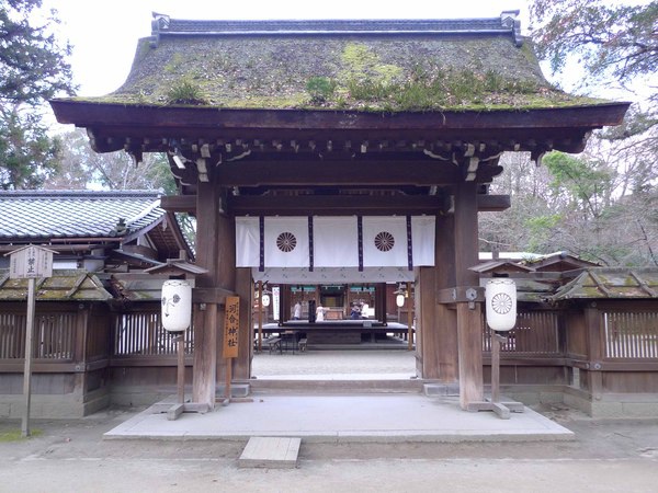 檜皮屋頂的「中門」,列為重要文化財,左邊是求御守的地方。