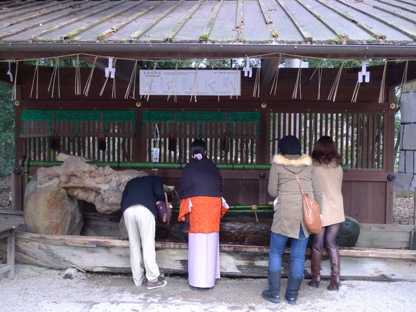 水槽是神話傳說中祭神的船型盤座石,最下方的木槽是 600 歲的古木做成的。