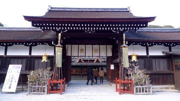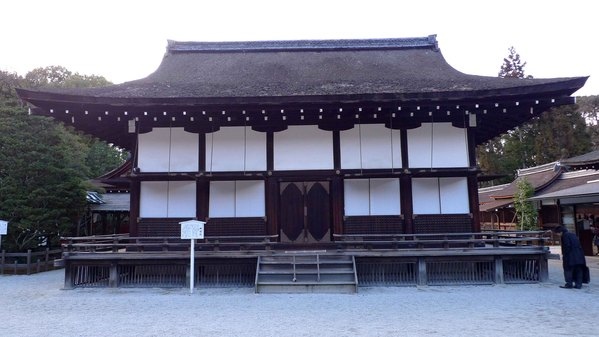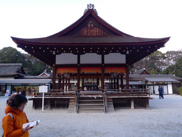 進了中門,裡面好多間社殿,但是架著鷹架,感覺雜亂侷促,和外面空曠的感覺完全不同,雖然屬於國寶的「東西本殿」都在裡面,主祭神~「賀茂建角身命」和「玉依姬命」都還沒拜到,但是我們遇到國寶卻不懂建築,逛神社又從來不參拜,現在內部施工,太陽又將下山,時空背景似乎都在暗示我們應該離開。