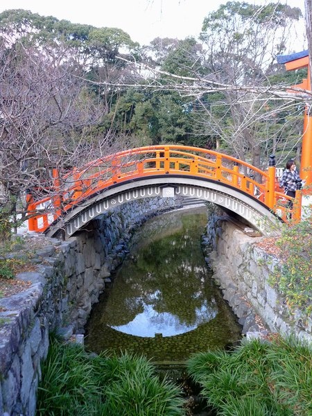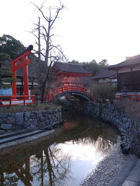 下午4:15,太陽已經準備下班了,從「御手洗社」回望樓門、輪橋、御手水川和東口鳥居。