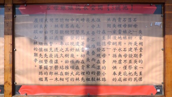 沿著幾乎沒車的霄裡路閒晃,看到「水井石母娘娘」的指標,彎進小路,看到這個解說涼亭。
