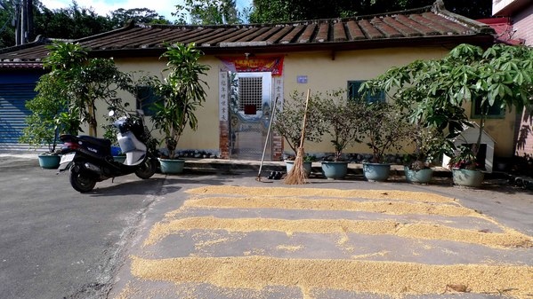 解說涼亭往前不遠就是「吳家故居」,稻埕前正曬著稻穀。