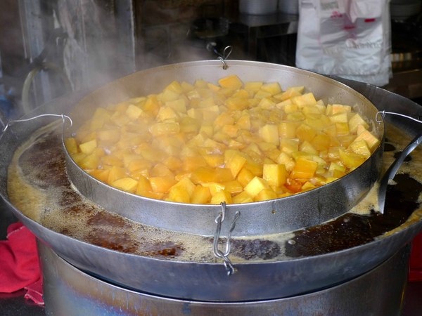 這鍋金黃的蕃薯經過細熬慢燉,把蕃薯裡面的糖份慢慢熬出來,熬成外鍋中深褐色濃稠香純的蕃薯糖漿,這樣慢工熬出的細活,難怪這麼美味。