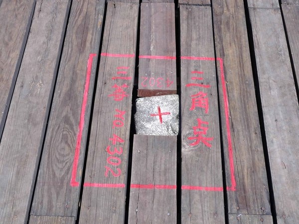 山頂的觀景台中央鑲有No.4302的三等三角點,台灣小百岳第089號,