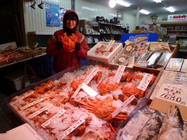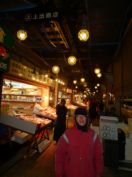 傍晚魚販收攤前還會來個降價大拍賣,叫賣聲非常熱鬧~很想買一箱帝王蟹,但是我們住在遙遠的台灣,不可能像千秋學長一樣買回家給野田妹當伴手禮,只好拍照就罷。