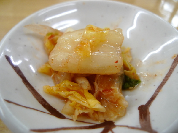我們運氣超好,根本不必等就有兩個櫃檯中央的位置等著我們,坐定之後,先送上一碟泡菜(免費)。