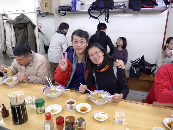 客人一進來就把外套掛在牆上,包包放在置物架上,慢慢等候;老闆看我們邊吃邊拍照,主動幫我們拍了這張合照,從表情看得出我們吃得很滿意。