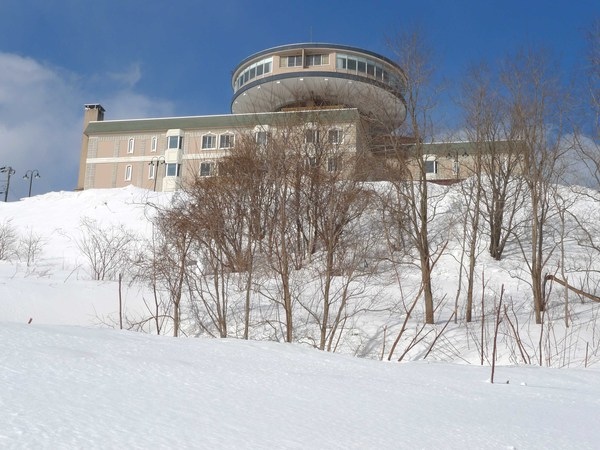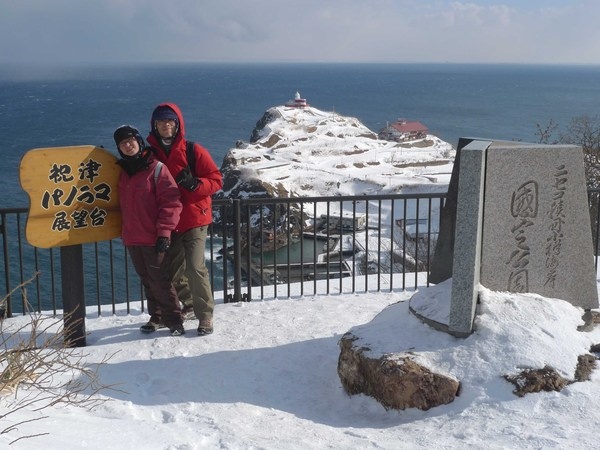 「赤岩山」頂設有展望台,可以360度展望四周景色,這裡屬於「二世古積丹小樽國定公園」,下面白雪皚皚的平台是「高島岬」,海岬上有紅白相間的「日和山燈塔」和紅色屋頂的古蹟~「小樽市鰊(ㄌ一ㄢˋ)御殿」。