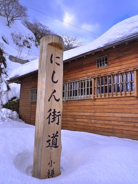 「鰊魚街道」的立牌就立在出張番屋旁邊。