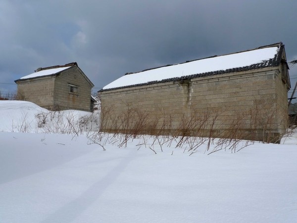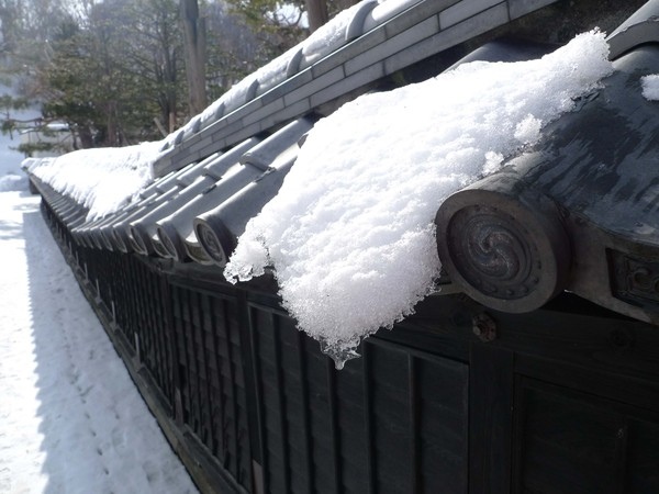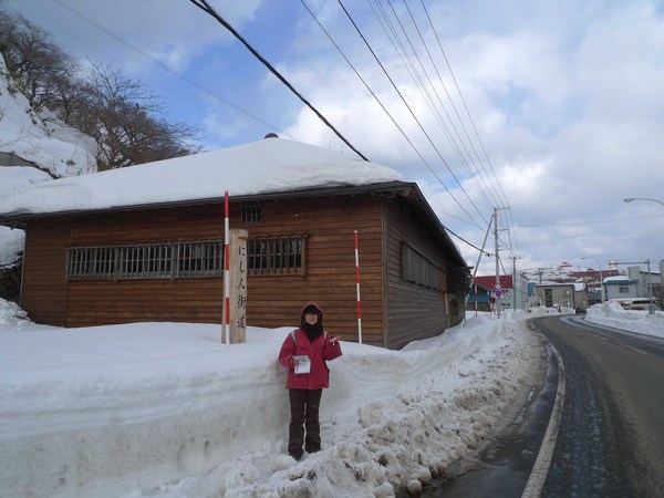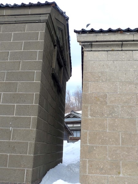 果然沒錯,這是茨木船主的家,就在出張番屋附近,前院立著一排花崗石柱與馬路隔開,但是大部分都被積雪覆蓋,只露出身後這兩根。