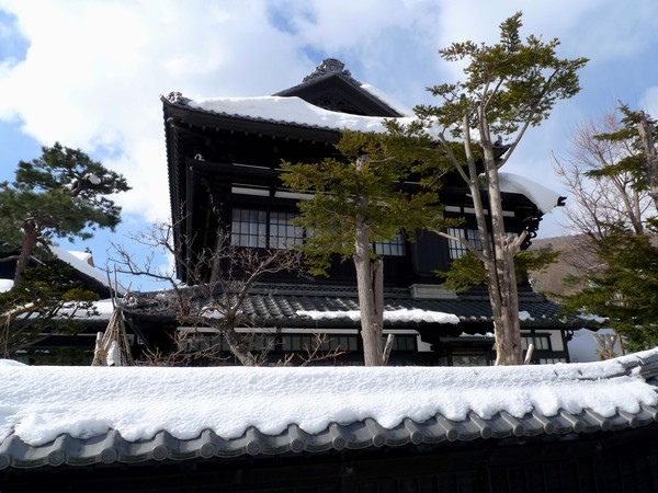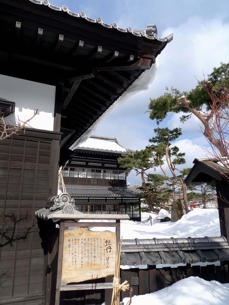 建物四周都是「枯山水」庭園造景,現在大雪冰封,到了五六月,這一隅可以欣賞牡丹盛開。