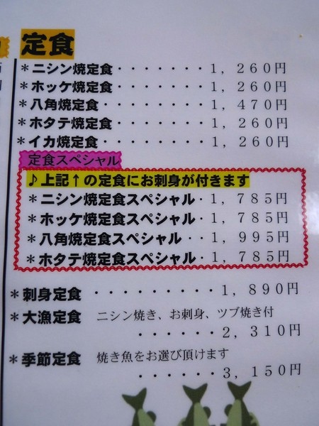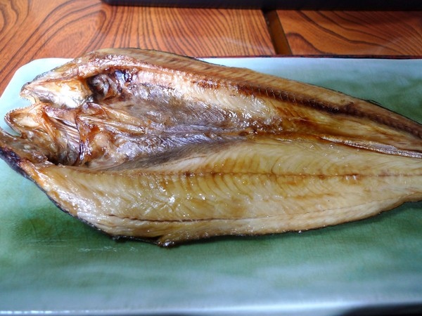 ほっけ焼き定食(烤花魚定食),「ほっけ」中文叫做「花鯽魚」,捕獲之後,立刻對剖做成「一夜干」,好大一尾,超好吃,我們愛上這種魚,特地把牠的名字記住,以後就會點了。