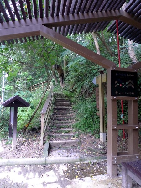 我們停車在49號道和往關刀山和龍騰斷橋的叉路口,停車處前就是「關刀山入口」公車站牌,等車亭旁邊的木牌指著階梯往上通到「勝興車站」。