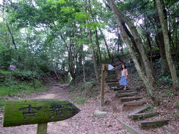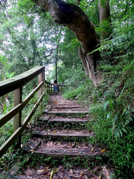 接著就來到一早經過的第一個岔路口,早上走左邊平坦的山路往勝興車站,現在我們爬上階梯,往「古道」前進。