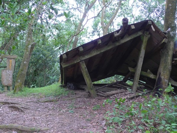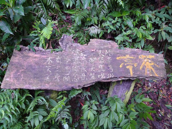 爬上階梯之後,看到倒塌的亭子,旁邊寫著「等食亭」。