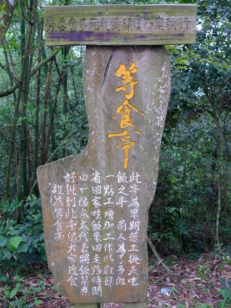 「早期苦工挑夫爲了增加工作時數,多做一些工,減少回家吃飯來回走路時間,所以由太太們輪流將飯菜煮好,挑到此亭供大家進食,故為『等食亭』」。