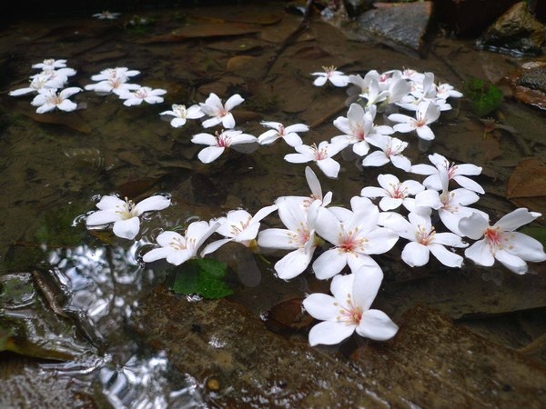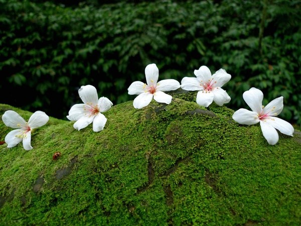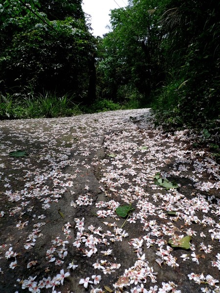 下山時,往「石門山東北峰」的山徑對面落滿油桐花,是此行最多的一處。