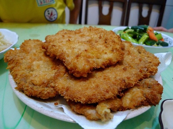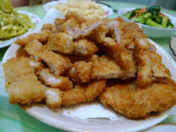 !炸排骨~裹著麵包粉,肉片味道醃得剛剛好,而且非常入味,剛剛在外面聞到的就是這個味兒,超香的!