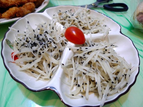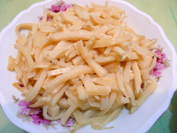筍子處理好、滾水燙熟,切絲之後,下鍋加鹽拌勻,就可以裝盤上桌了。