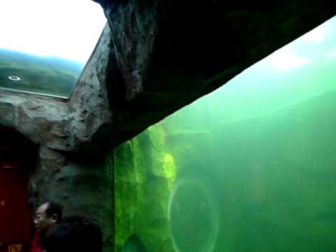 來一段斑紋海豹可愛的泳姿秀,這個圓桶水漕貫通上層室外露天池和室內池底: