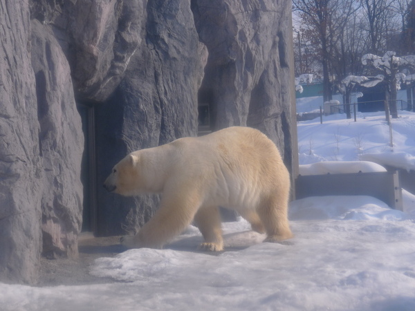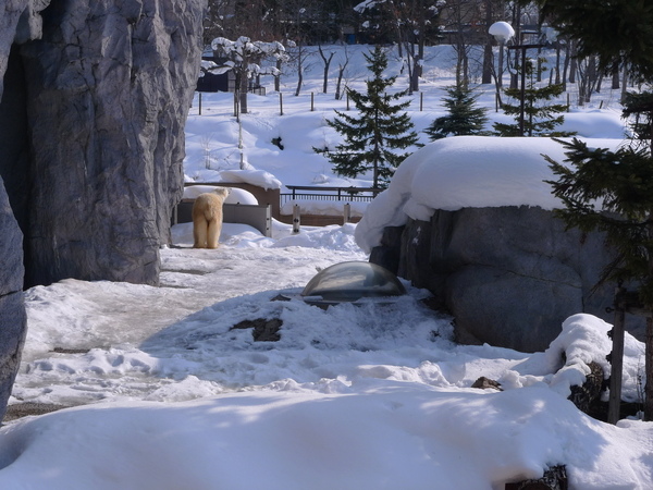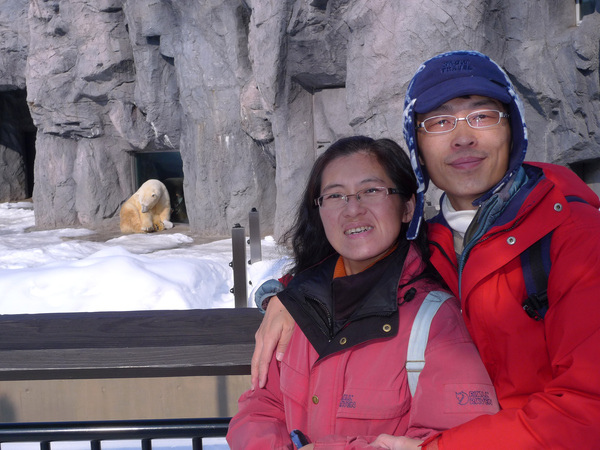 我們從「一般入口」進入,首先來到觀察室,據說這裡住著一對夫妻檔~イワン&ルル﹙伊凡和露露),去年11月露露出現懷孕徵兆,結果失敗,推測是因為這裡的經緯度和北極不同所致。場內安排了許多座位讓遊客可以透過玻璃欣賞北極熊跳水與游泳的姿態,只是早已坐滿、站滿了人,我們今天在這裡停留的時間非常有限,所以只好繼續往戶外走。