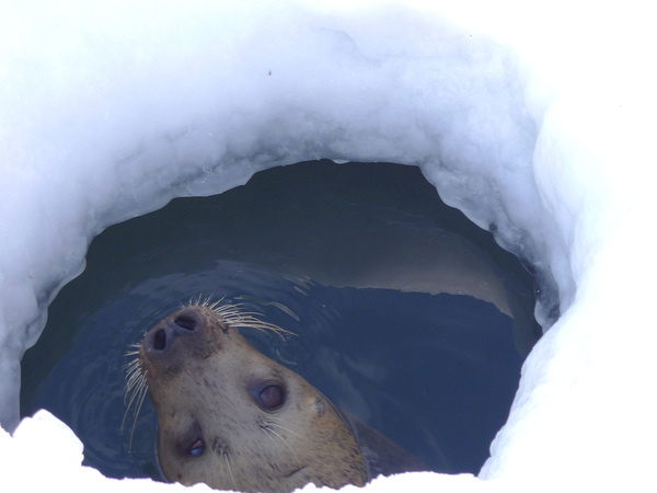 斑紋海豹好奇的探出頭來觀察我們,還好我們不是北極熊,不然就……
