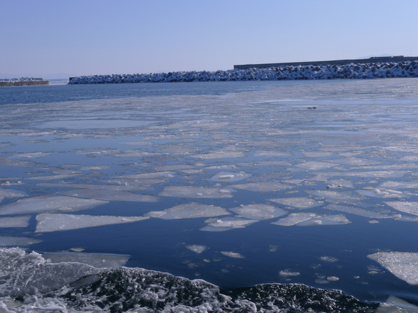 ↓內港中出現「幼年期的流冰」~「糊狀薄冰」+ 「小薄冰」=「新成冰」或「流冰Baby」。