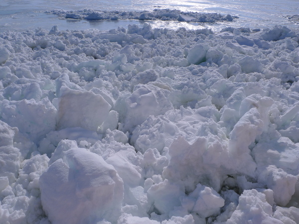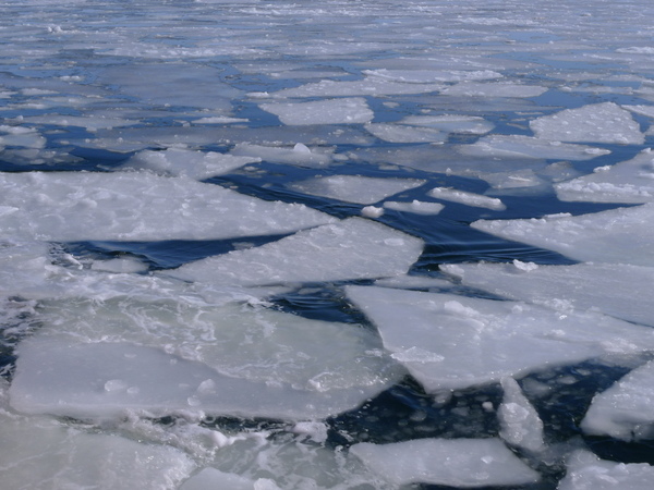 ◆流冰的成長階段:糊狀薄冰→小薄冰→蓮葉冰(Pancake Ice)→冰板(Ice Cake ),