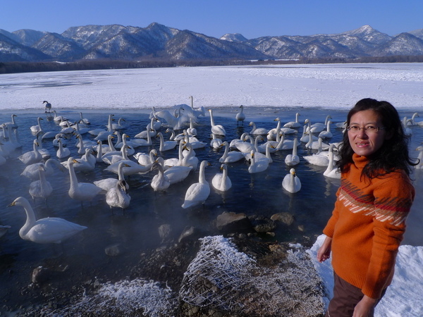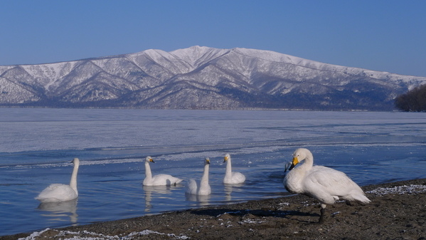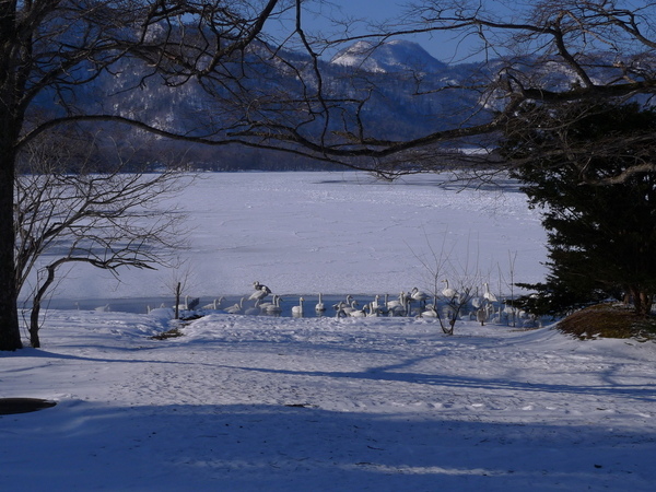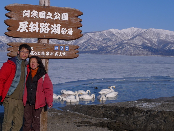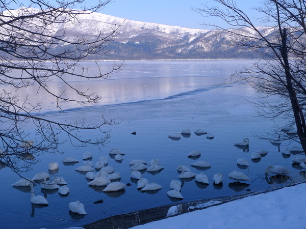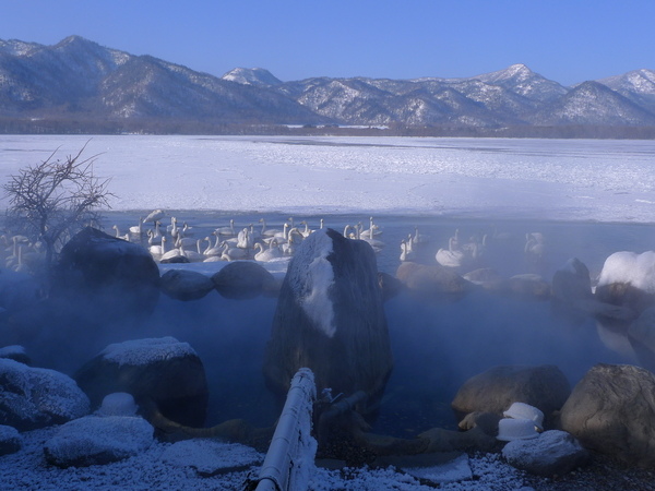 此時的「屈斜路湖」雖是湖面結冰的白雪冬季,但是「砂湯溫泉」的白鳥飛來地卻是春情盪漾啊!