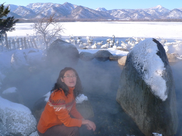 ↓由天鵝們的角度看古丹露天風呂,挺美的!可是小花花聽我這麼說,又開始罵個不停.......