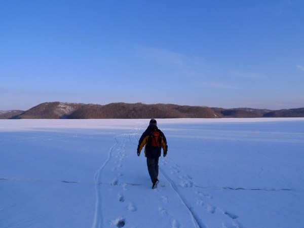 ↓停好了車,老闆領著我倆向湖心方向前進,雪地上的痕跡顯示已有人先行到此,