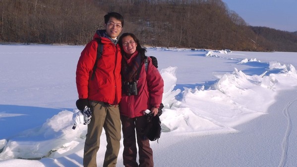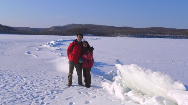↓感謝老闆幫我們夫妻倆與『御神渡』奇景合影,留下這麼值得紀念的畫面。